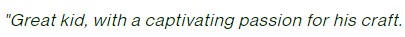 "Great kid, with captivating passion for his craft"